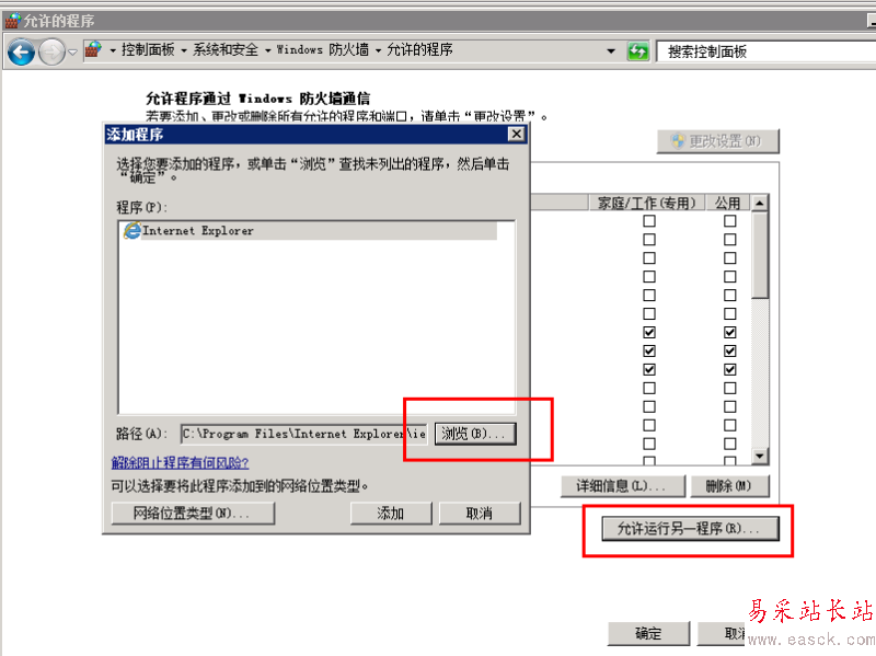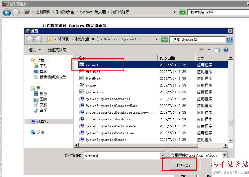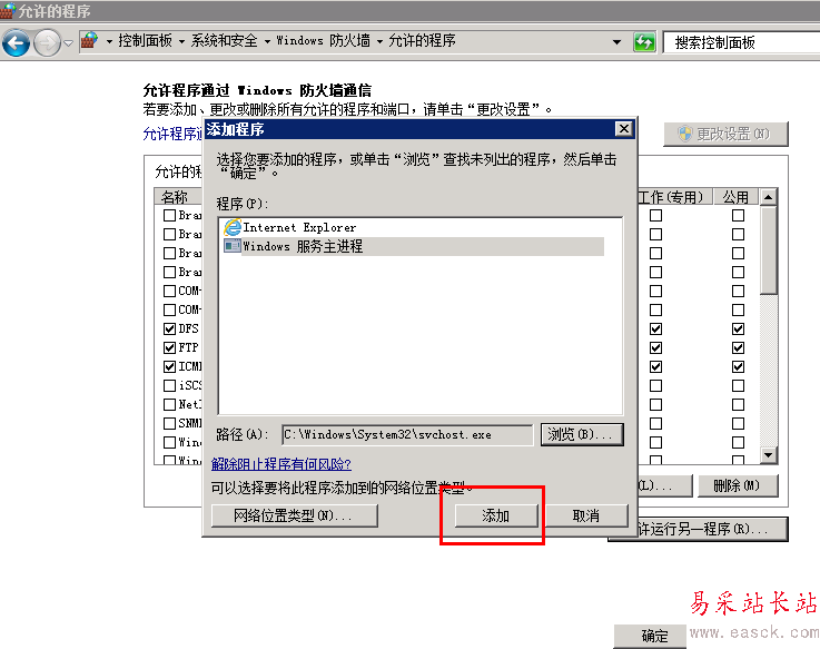 9)選擇允許運行另一程序,在添加程序中選擇瀏覽,選擇C:/windows/system32/svchost.exe就行打開添加,這時windows服務器主進程就添加在防火墻例外中,點擊確定后,這時就可以從外網訪問ftp。