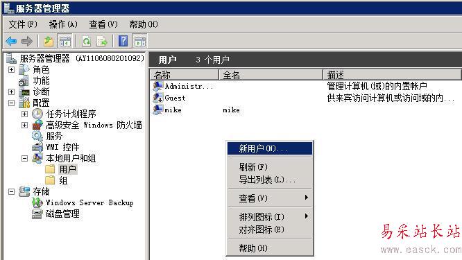 A. 選擇“服務管理器”->“配置”->“本地用戶和組”->“用戶”;在空白處右鍵選擇“新用戶”;
