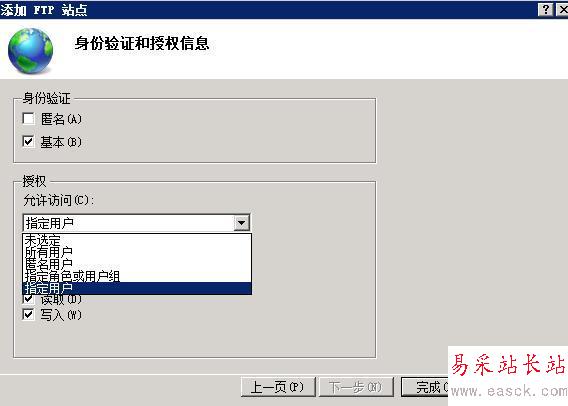 身份驗證請選擇“基本”,不建議開啟“匿名”;授權中允許訪問的用戶可以指定具體范圍,如果FTP用戶不需要很多的話,建議選擇“指定用戶”,權限選擇“讀取”和“寫入”;選擇“完成”。