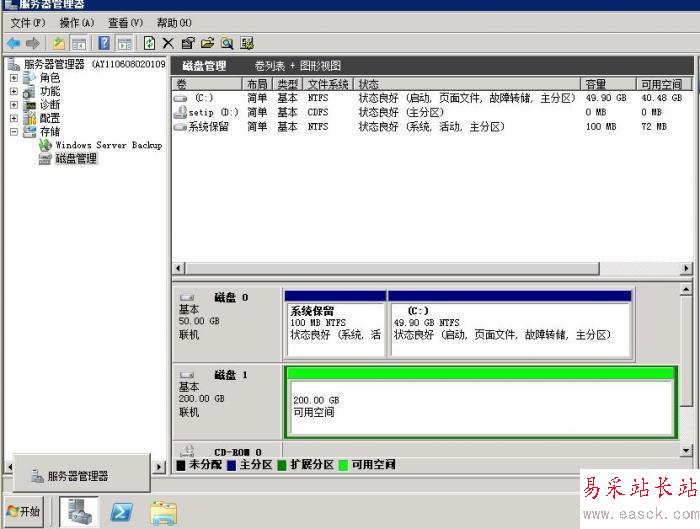 1、 啟動左下角任務欄中的“服務器管理器”,選擇“存儲”->“磁盤管理”;