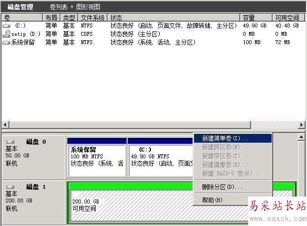 2、 在空白分區上,右鍵選擇“新建簡單卷”;
