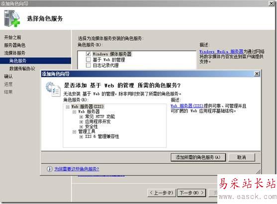選擇windows媒體服務器、基于Web方式的管理工具和日志代理功能。如果選擇安裝Web方式管理工具,需要安裝IIS組件。下一步