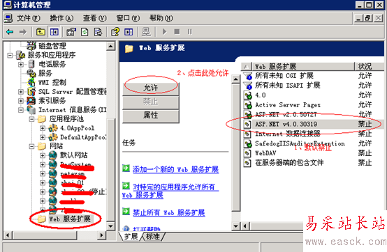2.修改IIS的web服務(wù)擴(kuò)展,默認(rèn)安裝后的ASP.NET v4.0.30319是禁止的,要修改為允許, 如下圖2-1;不然就會(huì)出現(xiàn)訪問網(wǎng)頁(yè)的時(shí)候,出現(xiàn)找不到該頁(yè)404的錯(cuò)誤;
