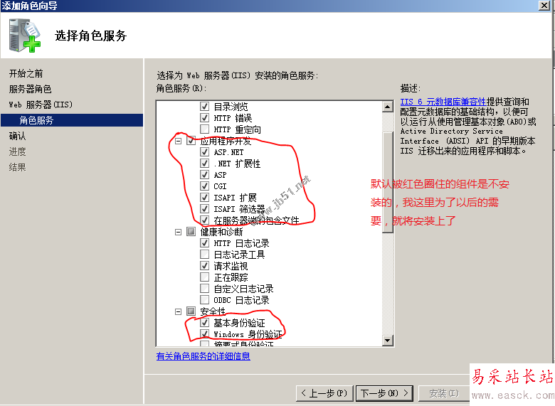 5、接下來,它會出現IIS需要安裝的一些必要組件,我在這里就將“應用程序開發”和安全性下面的“基本身份驗證”以及“windows身份驗證“也勾選上,注意,它默認是安裝IIS6.0和FTP6.0的服務的,
