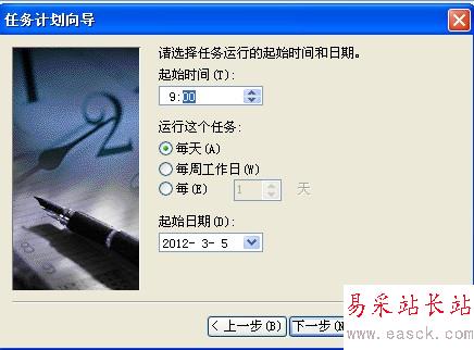 6:設置任務開始的時間和日期,默認情況是當前的時間和日期,我們將開始時間改為9:00,也就是我們上班的時間