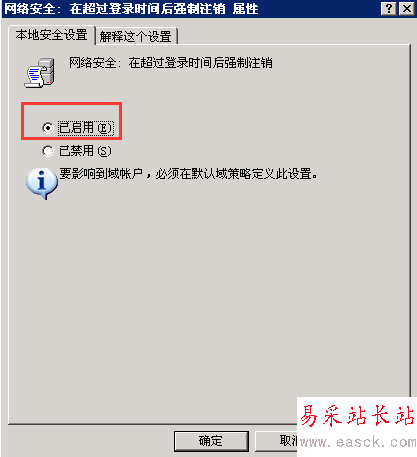 2、“網絡安全:在超過登錄時間后強制注銷” 默認為:已禁用 修改為 已啟用。