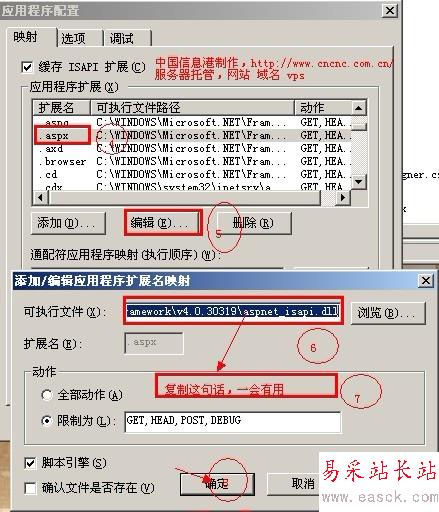 3.如右側窗口,找到 .aspx 擴展名——》編輯——》復制 可執行文件的路徑——》關閉