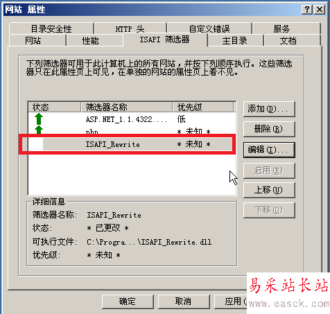 一路確定之后,我們重啟下IIS管理器,之后再次打開網站屬性的“ISAPI 篩選器”,看下是不是剛剛添加的ISAPI_Rewrite變為綠色向上的箭頭呢?這樣的話偽靜態就配置成功了。