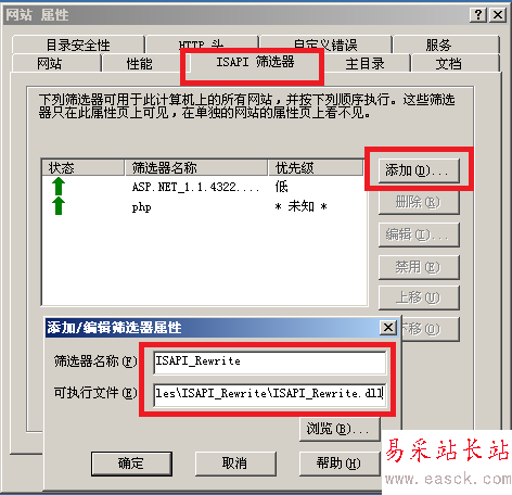選擇“ISAPI 篩選器”選項卡,點擊“添加”,彈出“添加/編輯篩選器屬性”,“篩選器名稱”寫上ISAPI_Rewrite,這個可以自定義;“可執行文件”這里,通 過“瀏覽”找到偽靜態組件安裝目錄下的ISAPI_Rewrite.dll文件即可,路徑是C:/Program Files/ISAPI_Rewrite/ISAPI_Rewrite.dll;