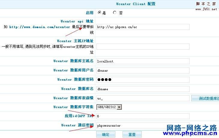 J.Ucenter 通信密鑰 與Ucenter添加PHPCMS應(yīng)用填寫的密鑰完全一致,本例是 phpcmsucenter123