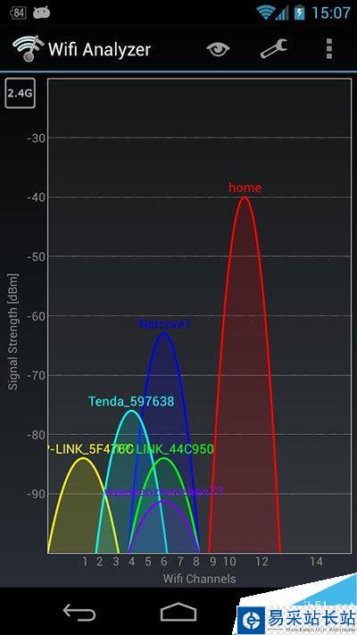 Android:Wifi 分析儀(Wifi Analyzer)幾乎是首選設備,直觀,易用。上圖中的紅色Home 就很好,單獨使用一個信道,看其他幾個已經擠在一起了,不怕懷孕么…