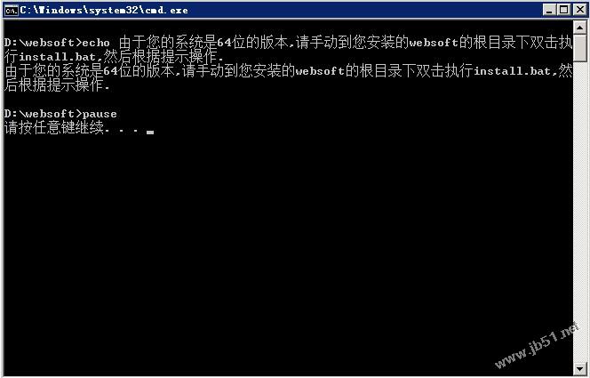 完成后會出現一個命令行界面,不用擔心,上面會提示手動到您安裝的websoft的目錄,執行install.bat
