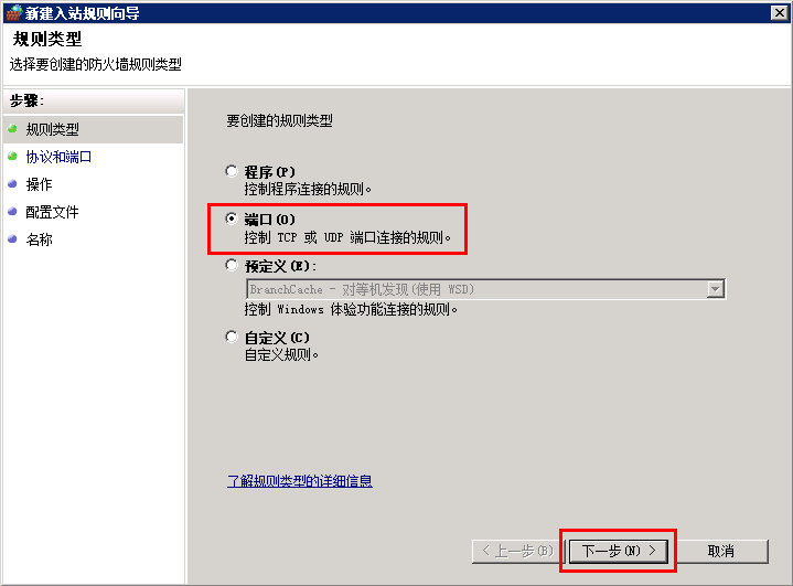 5、出現(xiàn)“新建入站規(guī)則向?qū)А边x擇“端口”,然后“下一步”,如下圖所示;