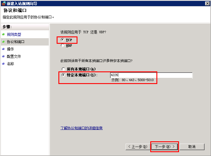 6、選擇“TCP”協(xié)議,然后在“特定本地端口”輸入用戶自定義的遠(yuǎn)程端口號,然后“下一步”,如下圖所示;