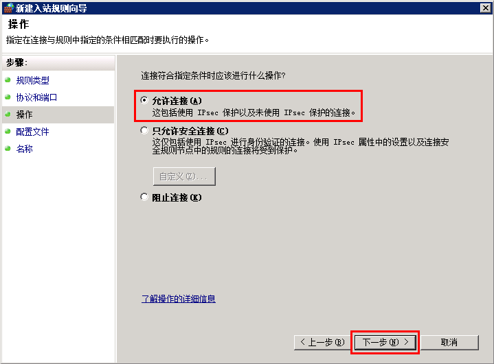 7、選擇“允許連接”,然后“下一步”,如下圖所示;