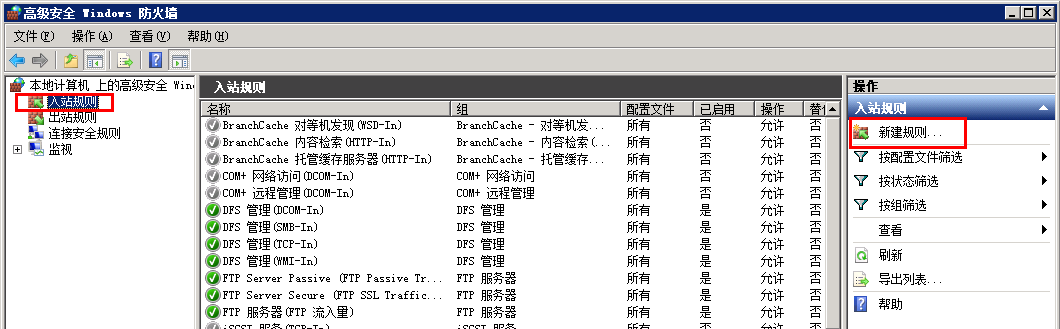 4、打開“高級安全Windows防火墻”后,首先選擇左側(cè)“入站規(guī)則”,然后在右側(cè)選擇“新建規(guī)則…”,如下圖所示;