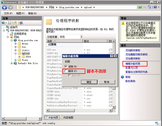 在iis7以上版本里,這個設置非常的方便。打開IIS管理器,找到站點,選中上傳目錄,在中間欄IIS下雙擊打開“處理程序映射”,再選擇“編輯功能權限”,把“腳本”前面的勾掉就可以了。