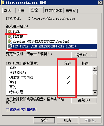 例如我在D盤根目錄下創建了一個wwwroot的目錄,再在里面創建了一個blog.postcha.com的目錄,這個目錄里面放的是我的網站程序。其中wwwroot只要繼存d盤的權限即可,而blog.postcha.com這個目錄,我們需要再添加二個權限,即IUSR和IIS_IUSRS。