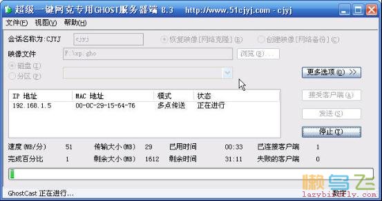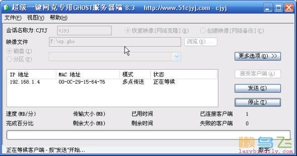 重復操作,直到所有的客戶端全部連接后點發送(我這里只連接了一臺客戶機),這時服務器端和客戶機端會同步顯示進度,耐心等待只到完成為止。