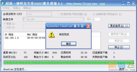耐心等待備份完成即可。網克完成后母盤機自動重新啟動,實際上這時候母盤機已經完成使命可以關機了。服務器端顯示傳送完成(如圖)。