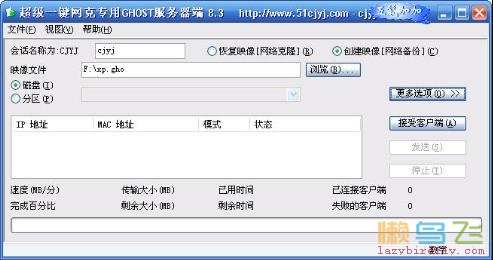 雙擊GhostSrv.exe,啟動GhostSrv。會話名稱填cjyj,大小寫不限。選擇創建映像,點下面的瀏覽選擇鏡像文件名稱和保存位置。弄好后點接受客戶端,至此,服務器上的操作告一段落。下面該去操作母盤機了。
