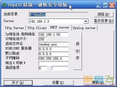 解壓超級一鍵網克到服務器的任意盤,比如E盤,雙擊TFTPD32.EXE,關閉防火墻,或者在應用規則里設為允許訪問網絡。最好關掉,否則下面你要點若干次允許。點DHCP server標簽,這里有幾個地方要填一下,當前目錄和server不要填,程序自動判斷。IP地址池隨便填,但要注意不要跟服務器的IP地址沖突,當然要符合規則,瞎填也不行,不會填的話就照著我那樣,IP地址的最后一位數字比服務器的大1就行了。^-^ 地址池大小:255。啟動文件名:onekey.pxe。子網掩碼:255.255.255.0。其它配置全部默認,填好以后單擊保存。搞定!