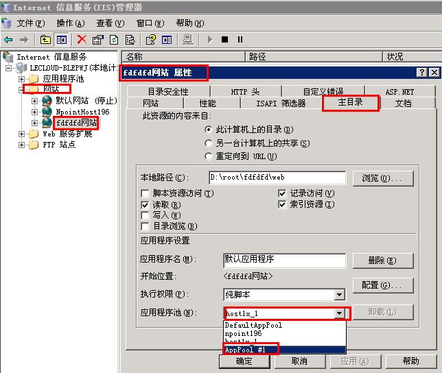 2. 在[網站]里邊找到[fdfdfd]這個網站,右鍵屬性--主目錄--應用程序池--Apppool #1(你要轉移到目的程序池)--點擊[應用]--確定。如下圖