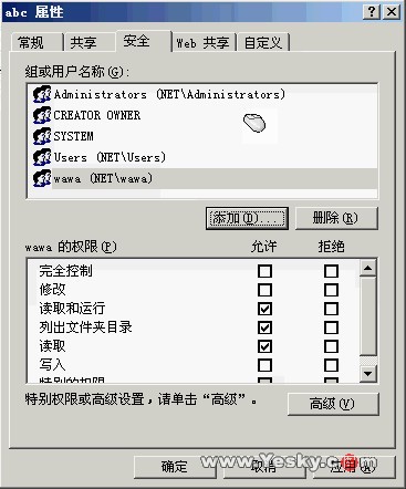 接下來(lái)為這個(gè)組和組里成員分別建立各自的文件夾,先建立一個(gè)文件夾,名字叫abc,在屬性的安全標(biāo)簽里添加新的安全設(shè)定,把這個(gè)文件夾設(shè)置為wawa組只讀,如圖4所示。然后在abc文件夾下新建3個(gè)文件夾,分別為a,b,c,并分別把每個(gè)文件夾的權(quán)限設(shè)置為指定用戶完全訪問,即a文件夾設(shè)置為a用戶完全訪問,b文件夾設(shè)置為b用戶完全訪問,c文件夾設(shè)置c用戶完全訪問,如果用戶很多的話,依次類推,如圖5所示。