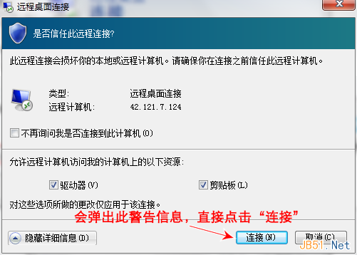 連接并且不向我發(fā)出警告:使用此選項(xiàng),即使遠(yuǎn)程桌面連接無(wú)法驗(yàn)證遠(yuǎn)程計(jì)算機(jī)的身份,它仍然會(huì)連接。