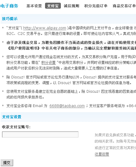 現(xiàn)金/積分兌換比率:設(shè)置真實(shí)貨幣現(xiàn)金(以人民幣元為單位)與論壇交易積分間的兌換比率,例如設(shè)置為 10,則 1 元人民幣可以兌換 10 個(gè)單位的交易積分。本功能需開啟交易積分,并成功進(jìn)行支付寶收款賬號(hào)的相關(guān)設(shè)置后方可使用,如果禁止使用現(xiàn)金與交易積分的兌換功能,請(qǐng)?jiān)O(shè)置為 0。