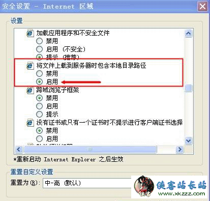 你也可以用“自定義安全設置”的方法選中下圖中的復選取框,主要安裝完Internet Explorer 8 Beta 1后把被更改的瀏覽器安全設置中的【將文件上傳到服務器時包含本地目錄路徑】下面這一項為“啟用”。
