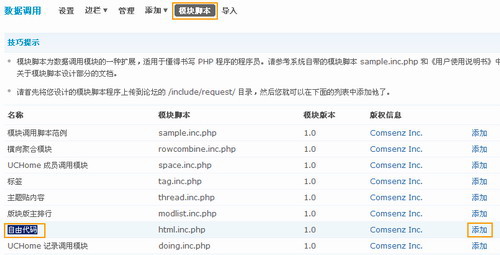 在當(dāng)前頁面點(diǎn)擊“模塊腳本”,然后在下面列出來的模塊中找到“自由代碼”,點(diǎn)擊后面的添加