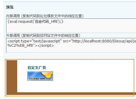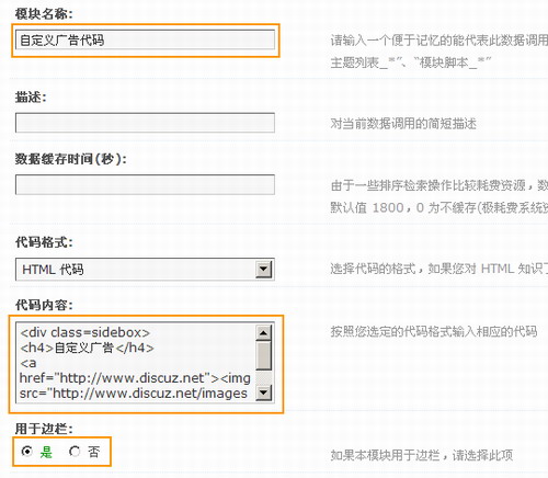 在頁面中填寫各項(xiàng)參數(shù),模塊名稱是必須填的,然后下面兩項(xiàng)可以不填。在代碼格式里面可以選擇 html 代碼或者是 Discuz! 代碼,如果您了解 html 代碼,那么可以直接把寫好的 html 代碼復(fù)制到這里面,或者將別人提供的廣告代碼粘貼到這里,比如說 Google 的廣告代碼。如果您不了解 html 代碼,也可以使用 Discuz! 代碼,是與在論壇中發(fā)帖是一樣的。