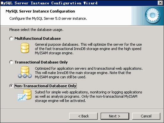 選擇 MySQL 數據庫默認存儲方式:Non-Trans Only ( MYISAM) 如下圖所示: