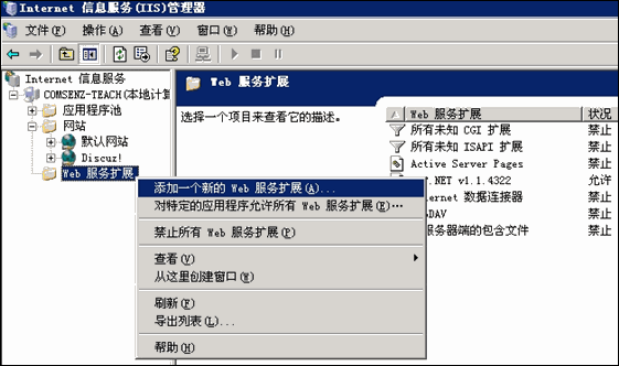 (4) 右鍵單擊"Web 服務擴展",添加 PHP 擴展支持。如下圖所示:
