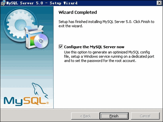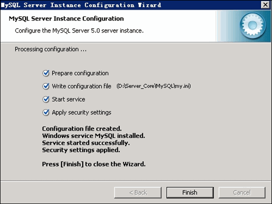 待文件復制安裝完畢后,進行 MySQL 設置界面,單擊 Finish 。如下圖所示: