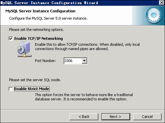 設定 MySQL 網絡參數,注意:不要啟用 Strict Mode! 如下圖所示: