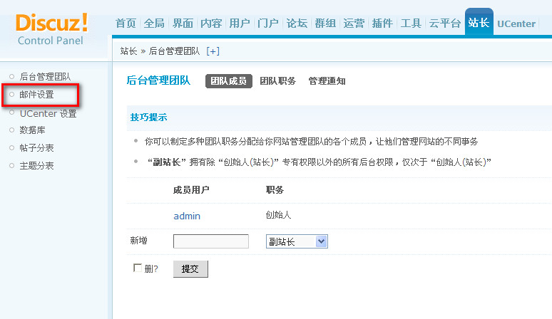 2、站點(diǎn)創(chuàng)始人登錄后臺(tái) => 基本設(shè)置 => 站長(zhǎng)設(shè)置 => 郵件設(shè)置 如下圖所示: