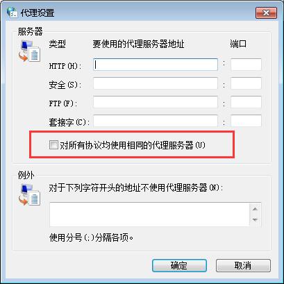 第九步:各種代理連接都是使用相同的服務器和端口,所以就直接勾選“對所有協議均使用相同的代理服務器”。
