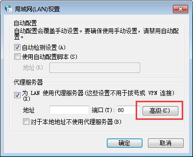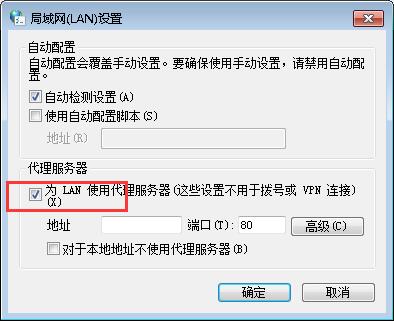 第五步:勾選“為LAN使用代理服務器”,在下面的地址欄后面輸入服務器地址,端口后面填寫服務器提供上網的端口。