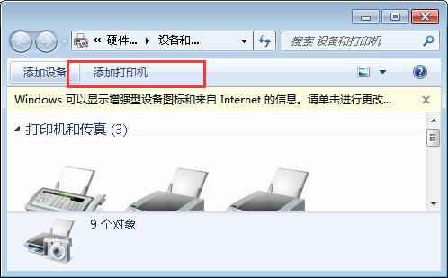 2、單擊“設備和打印機”窗口中工具欄上的“添加打印機”;
