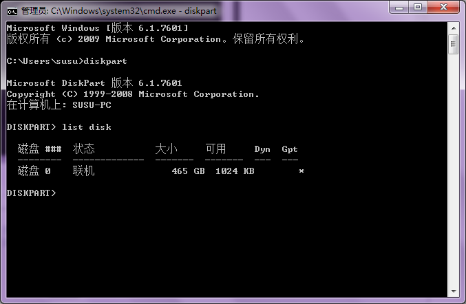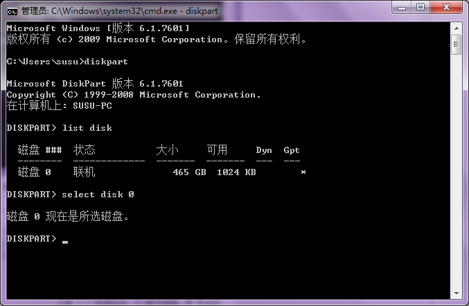 5.找到其中磁盤大小最大的那個 就是硬盤 比如我的 是磁盤0 。輸入select disk 0