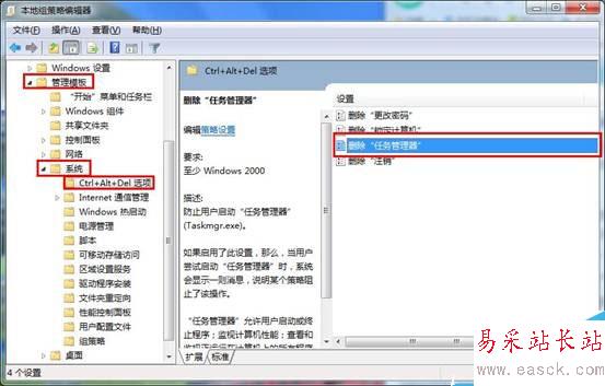 2、打開本地組策略編輯器窗口后,依次點(diǎn)擊展開“用戶配置/管理模板/系統(tǒng)/Ctrl+Alt+Del選項(xiàng)”,我們在右邊窗格中鼠標(biāo)左鍵雙擊“刪除任務(wù)管理器”,如下圖所示: