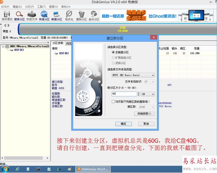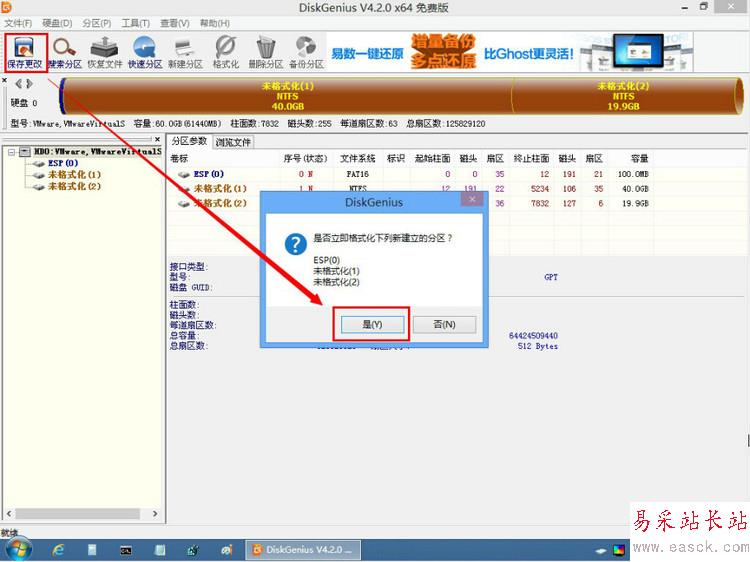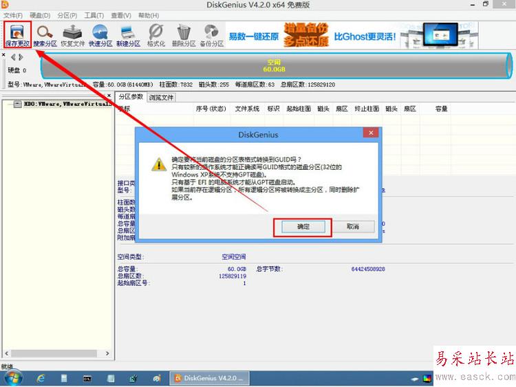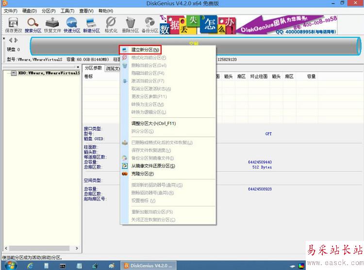 這里要注意的是,如果你當前硬盤已經有數據了,且不想影響數據,則請下載DiskGenius專業版,并運行64位專業版。因為PE里的DiskGenius是免費版,不支持在數據無損的情況下MBR轉GPT或GPT轉MBR。這里實驗的環境是空硬盤,所以直接建立GPT分區。如下圖: