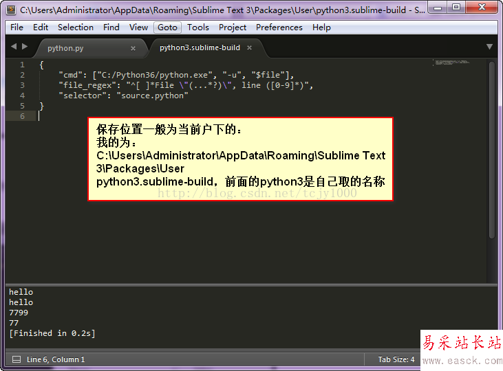 { "cmd": ["C:/Python36/python.exe", "-u", "$file"], "file_regex": "^[ ]*File /"(...*?)/", line ([0-9]*)", "selector": "source.python", "encoding": "cp936" } 保存路徑看一下:win7 64位下:一般為