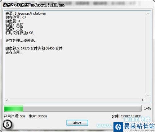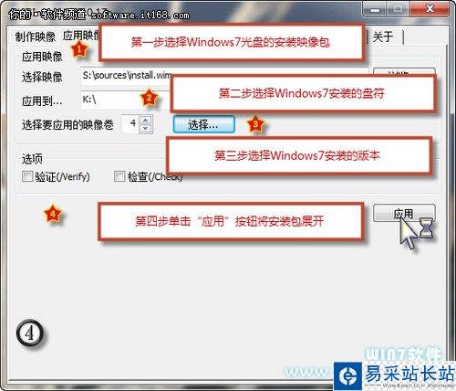 選擇之后回到剛剛的界面。然后再點“應(yīng)用”按鈕即可將Win7的安裝映像展開到盤符了,這樣的話Win7的所有安裝需要文件就會被全部部署到我們想要的分區(qū)。但是還沒結(jié)束。