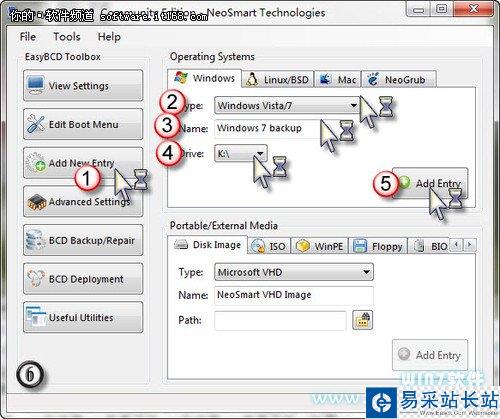 在EasyBCD窗口單擊“Add New Entry”(添加新的啟動項目)按鈕,然后,在右側(cè)的“Windows”下選擇“Type”(類型)為“Windows Vista/7”,輸入“Name”(名字)為“Win7”,設(shè)置“Drive”為剛才的安裝盤符,再單擊“Add Entry”按鈕即可添加成功(如圖6)。