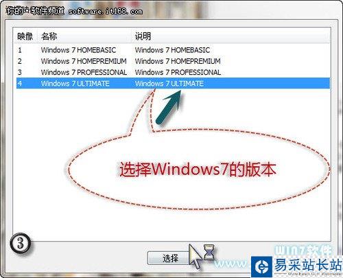 然后我們打開GimageX。在彈出的窗口單擊“應(yīng)用映像”選項。在“應(yīng)用映像”下的“選擇映像”旁邊單擊“瀏覽”按鈕選擇Win7虛擬盤符中的"instll.wim"映像文件,再單擊“應(yīng)用到”旁邊的“瀏覽”按鈕選擇一個安裝系統(tǒng)的盤符,接下來單擊“選擇要應(yīng)用的映像卷”旁邊的“選擇”按鈕選擇Win7的版本,我們使用的是旗艦版版本。選擇第四項(如圖3)。