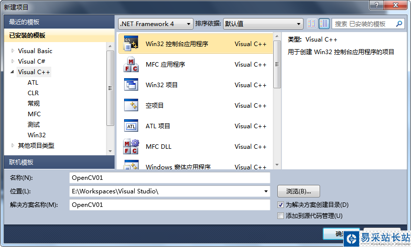 1、啟動VS2010,新建一個Win32控制臺應用程序OpenCV01;