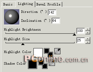 7、選中打孔后生成的橢圓環對象,執行properties屬性面板的effects ---> eye candy 4000 le ---> bevel boss 效果命令,在彈出的設置框中進行設定:basic選項不用進行修改了,bevel profile選項也保持默認,lighting選項需要進行一些簡單的調整,具體的數值大小根據橢圓環的大小來設定,本步的目的就是要產生園環的高光點效果,可以通過觀察預覽窗口的效果來進行調整,本例設定數值如下圖所示: